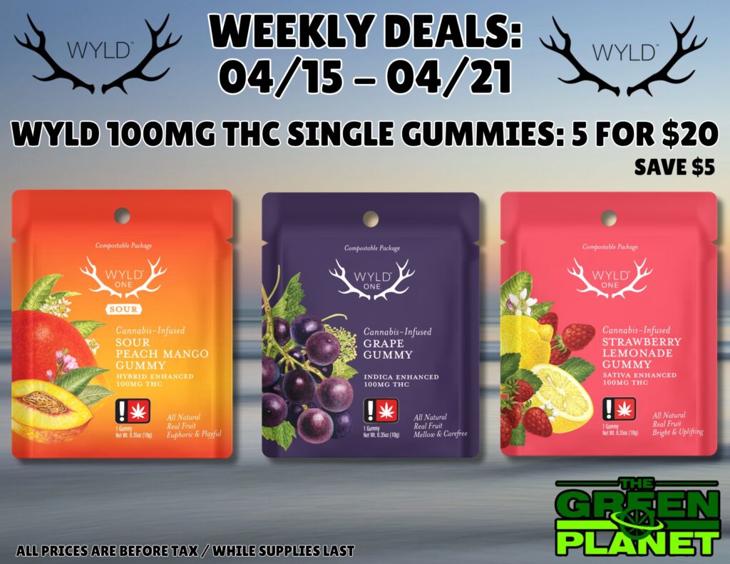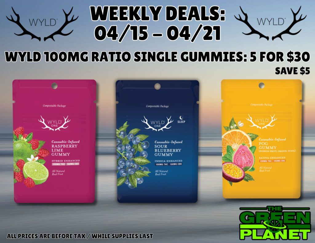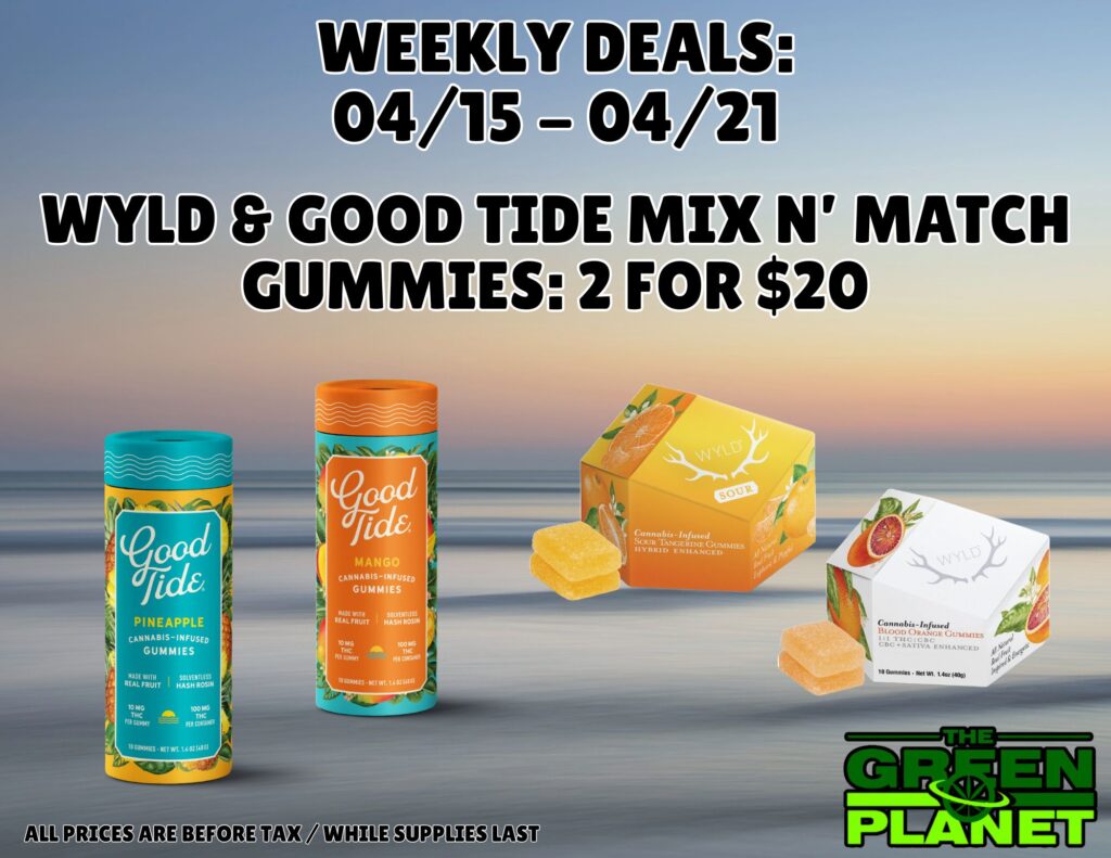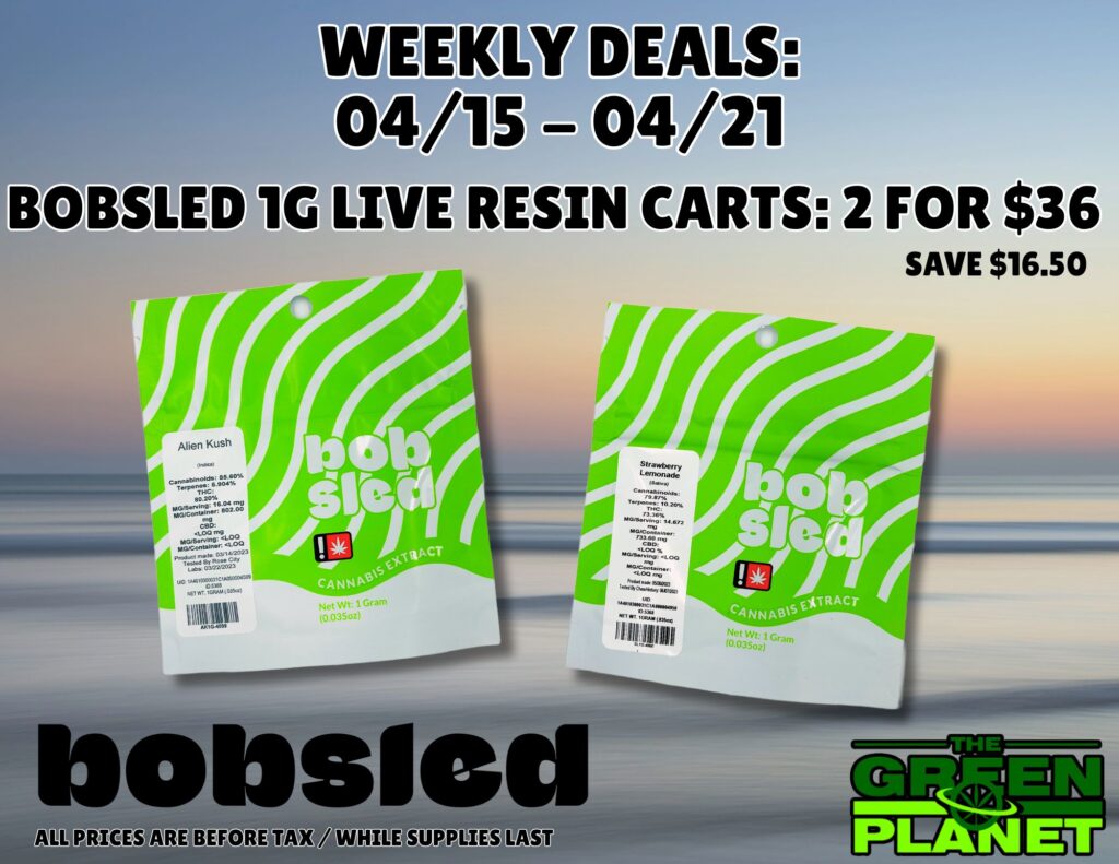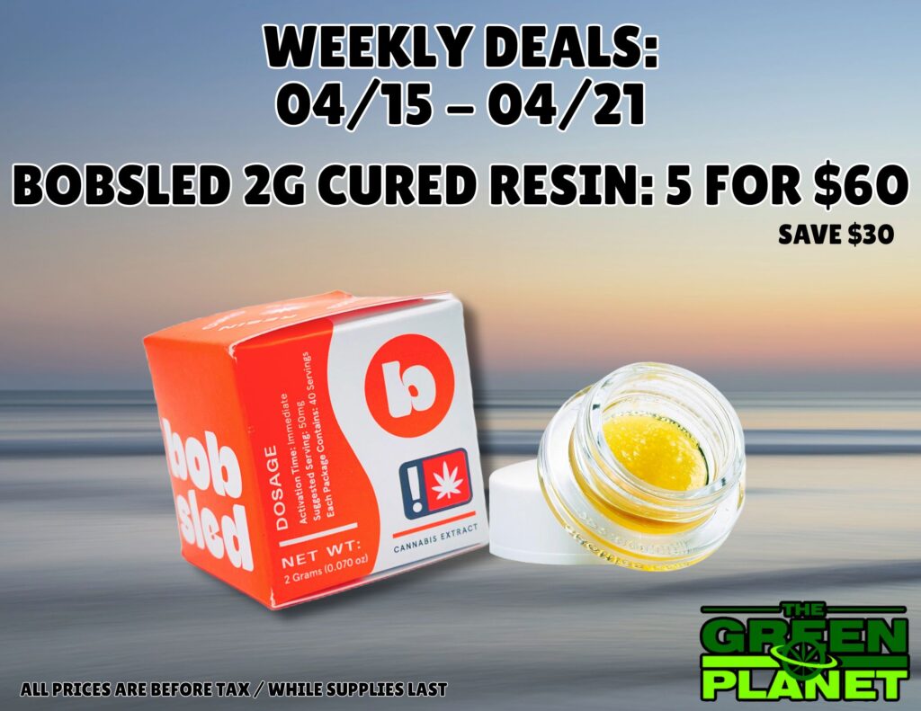 Weekly Sale 04/15 – 04/21Bobsled 1g Live Resin Carts: 2 for $36Bobsled 2g Cured Resin Dabs: 5 for $60Botz 100mg THC Single Gummies: 5 for $20Wyld 100mg THC Single Gummies: 5 for $20Wyld 100mg Ratio Single Gummies: 5 for $30Wyld and Good Tide 100mg Gummies Mix N’ Match: 2 for $20