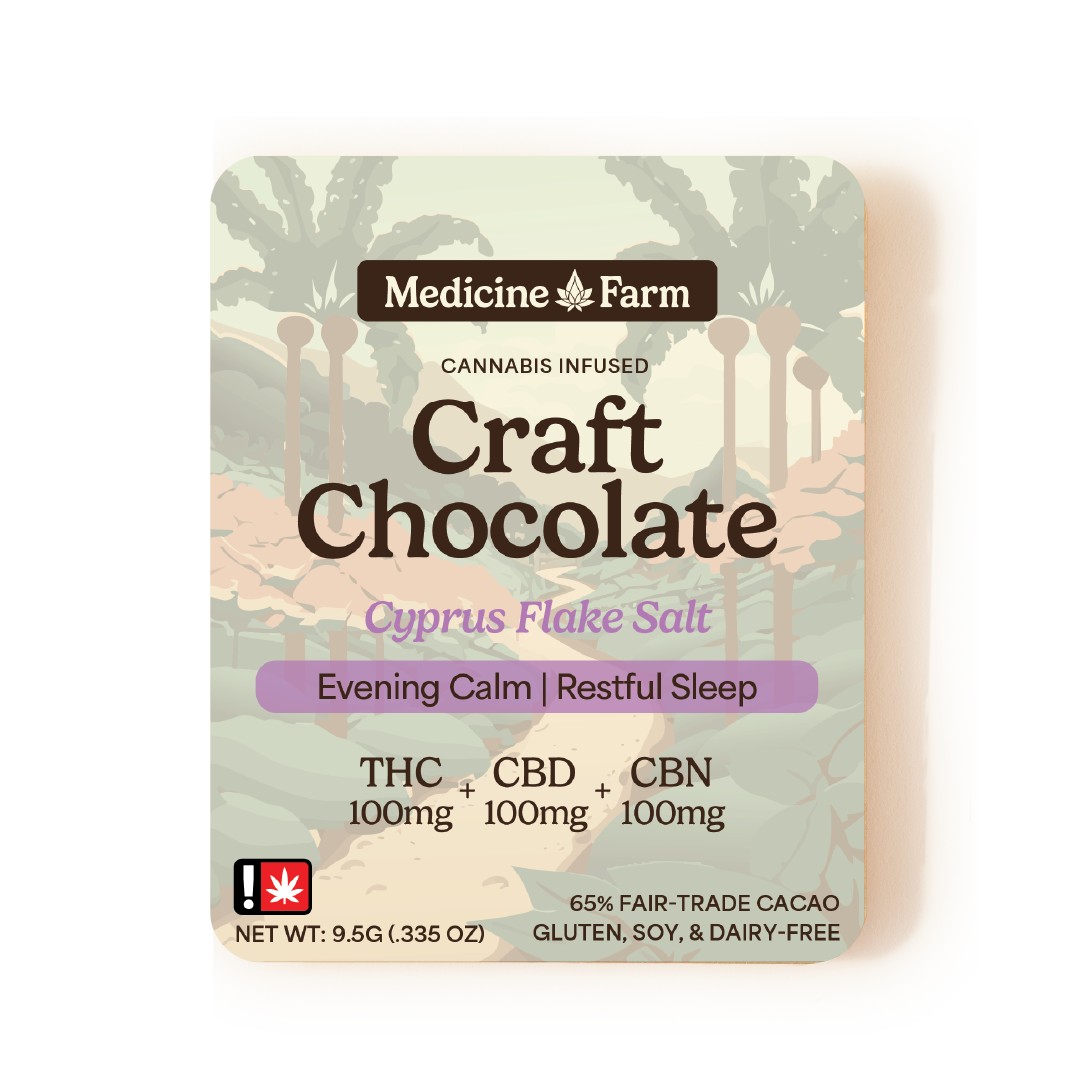 MF 1:1:1 THC:CBD:CBN CYPRUS MINI CRAFT CHOCO BARCyprus Flake Salt | 100mg 1:1:1 THC:CBD:CBN | Mini Chocolate Bar | .335 oz Strain: No Strain Brand: Medicine Farms Type: Edible THC: 100.00% CBD: 100.00%