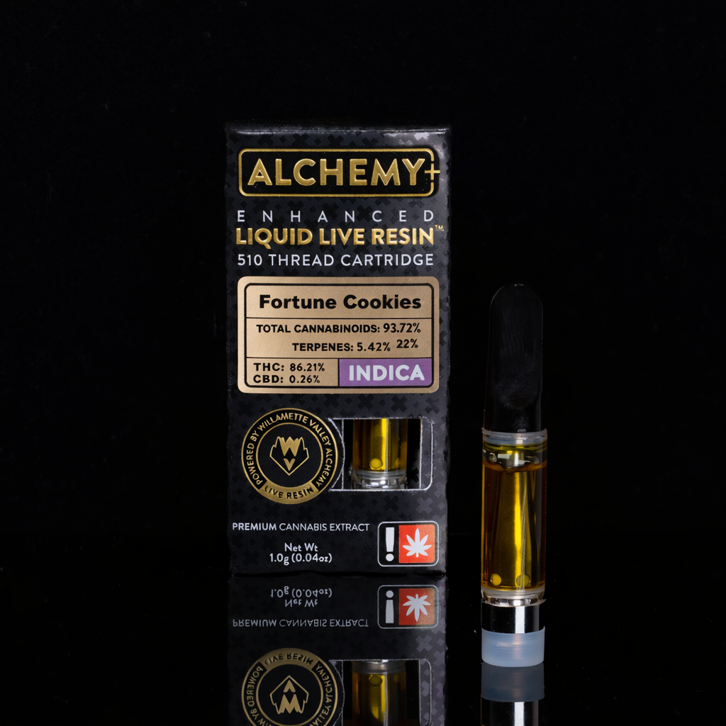 Fortune Cookies | 1g | Live Resin + Distillate Cartridge | Indica Strain: No Strain Brand: WILLAMETTE VALLEY ALCHEMY Type: Cartridge THC: 82.94% CBD: 0.19%