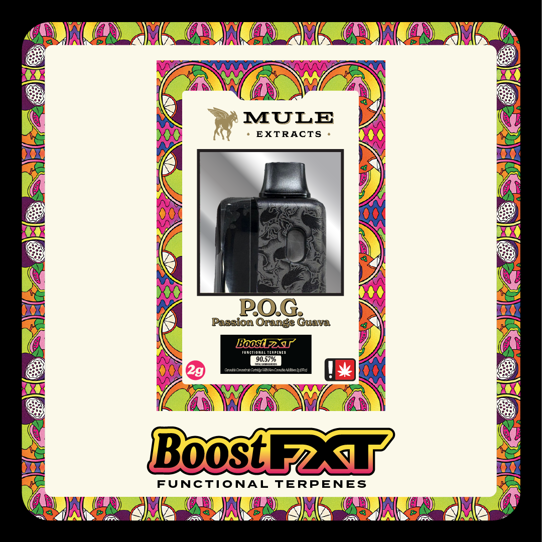 MULE 2G FXT P.O.G DIST TANK – BOOSTaio pogMULE 2G FXT PASSION ORANGE GUAVA DISTILLATE TANK – BOOST Strain: No Strain Brand: MULE EXTRACTS Type: Cartridge CBD: 0.24%
