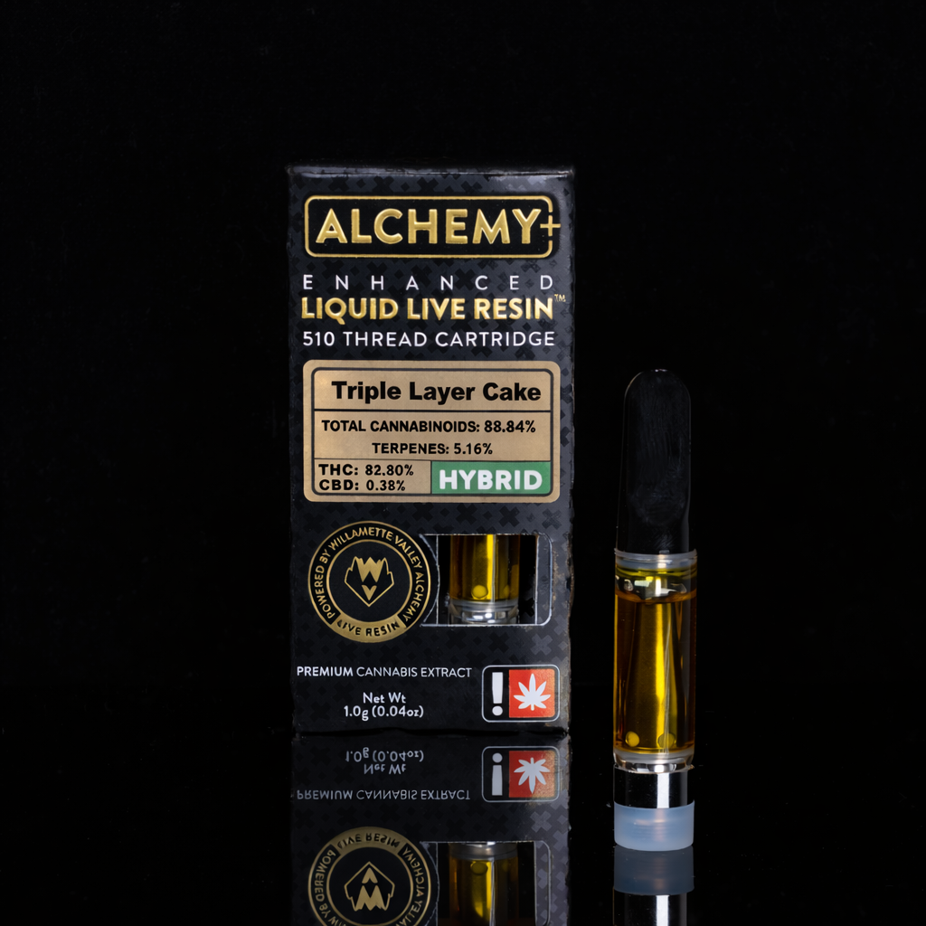 Triple Layer Cake | 1g | Live Resin + Distillate Cartridge | Hybrid Strain: No Strain Brand: WILLAMETTE VALLEY ALCHEMY Type: Cartridge THC: 82.74% CBD: 0.25%