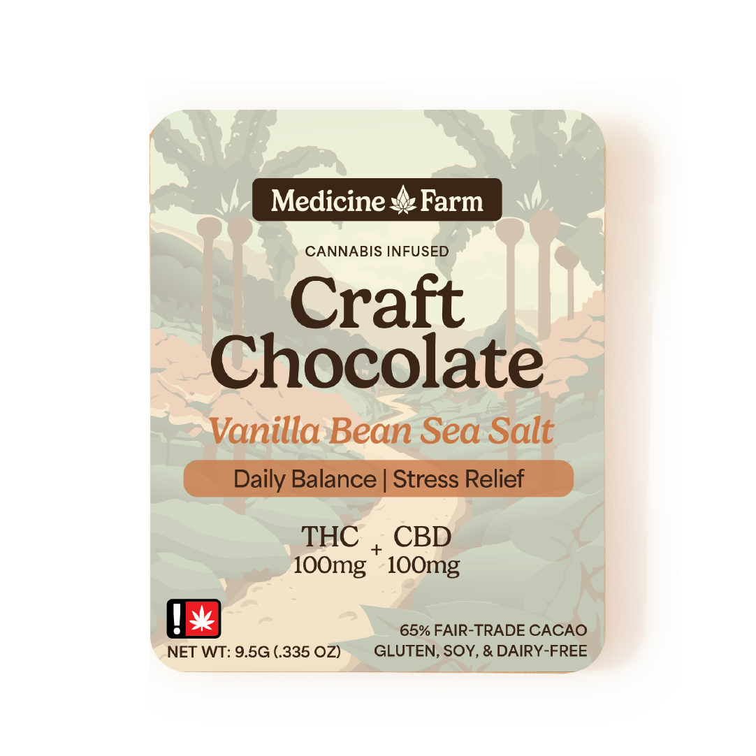 MF 1:1 THC:CBD VAN SEA SALT MINI CRAFT CHOCO BARVanilla Bean Sea Salt | 100mg 1:1 THC:CBD | Mini Chocolate Bar | .335 oz Strain: No Strain Brand: Medicine Farms Type: Edible THC: 100.00% CBD: 100.00%