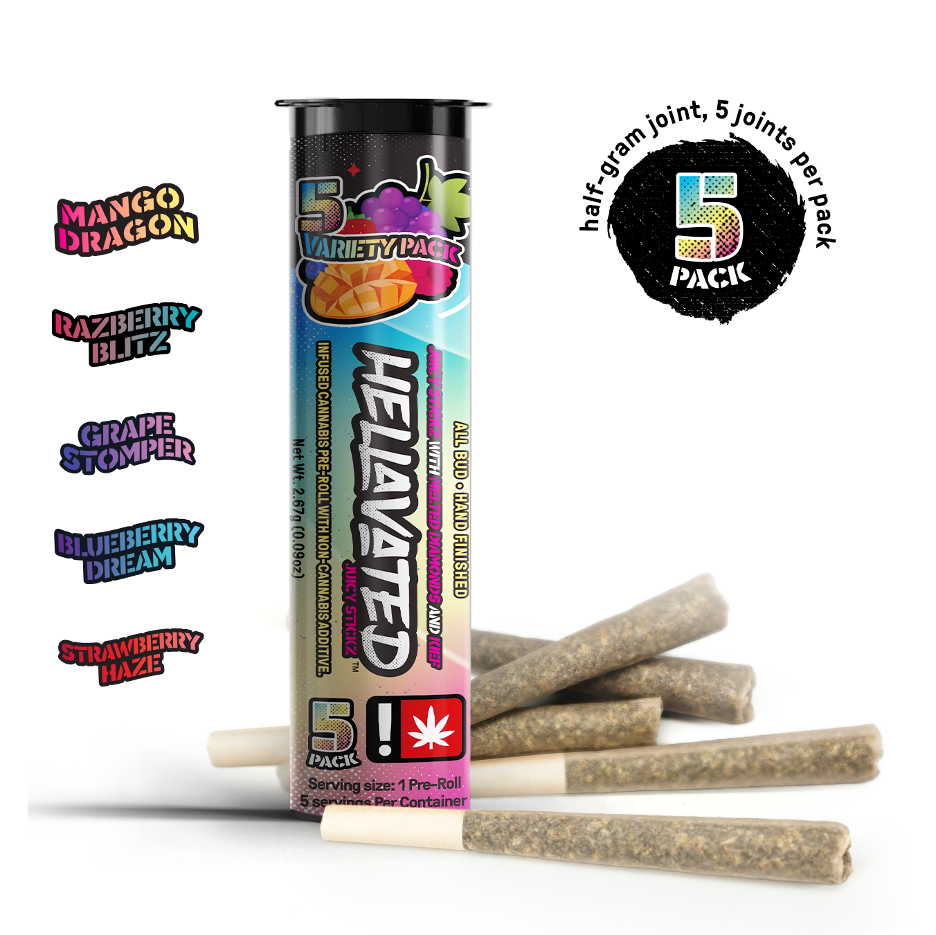 HELLAVATED .5G VARIETY 5PK JUICY STICKZMIXEDVariety | Infused Preroll | 5 Pack .5g | 2.5g total